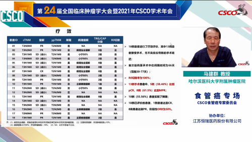 哈尔滨医科大学附属肿瘤医院马建群教授团队发起的卡瑞利珠单抗联合紫杉醇和奈达铂新辅助治疗局部晚期食管鳞癌的单臂、开发、探索性Ⅱ期临床研究(ESPRIT研究)在2021年CSCO学术年会上发表,并由马建群教授代表研究团队对该研究进行口头汇报。