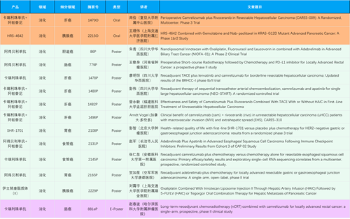 在消化系统肿瘤领域,PG产品相关研究共入选2项口头报告、11项壁报和1项电子壁报,共14项研究。除卡瑞利珠单抗和阿帕替尼外,还有4篇阿得贝利单抗治疗消化系统肿瘤研究入选。HRS-4642、瑞拉芙普-α注射液(SHR-1701)等在研创新产品也有相应研究亮相。另有1项伊立替康脂质体(II)用于胰腺癌治疗的研究入选壁报。